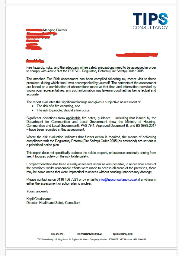 TIPS Consultancy Ltd provides professional fire risk assessments throughout the UK for offices, warehouses, factories, retail, HMOs and other commercial premises – helping you stay compliant, protect people, and avoid enforcement action.