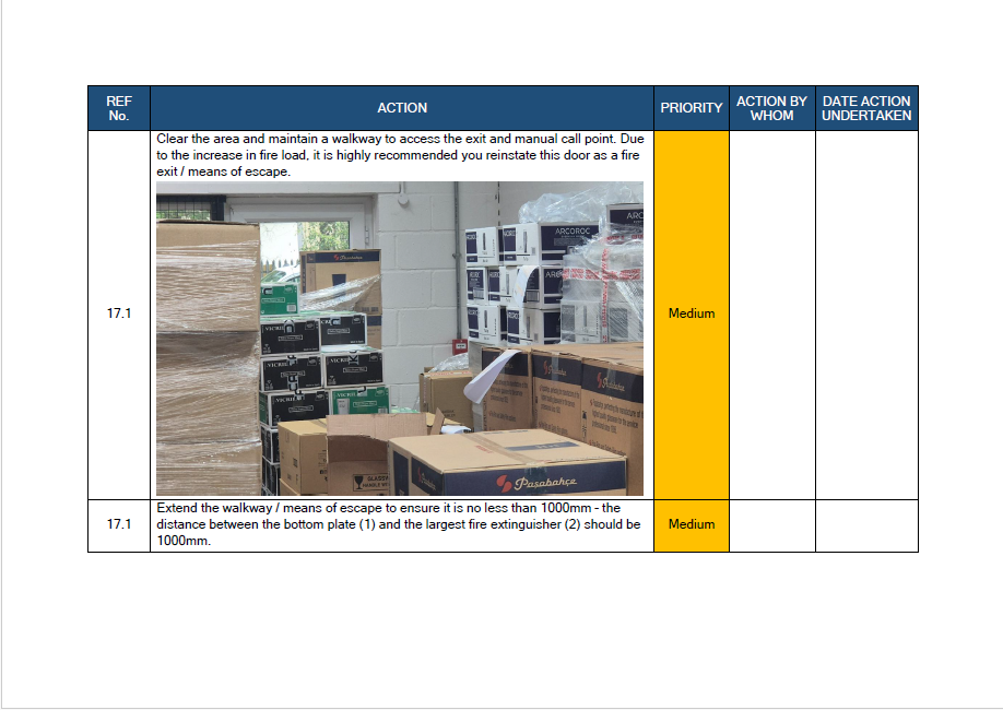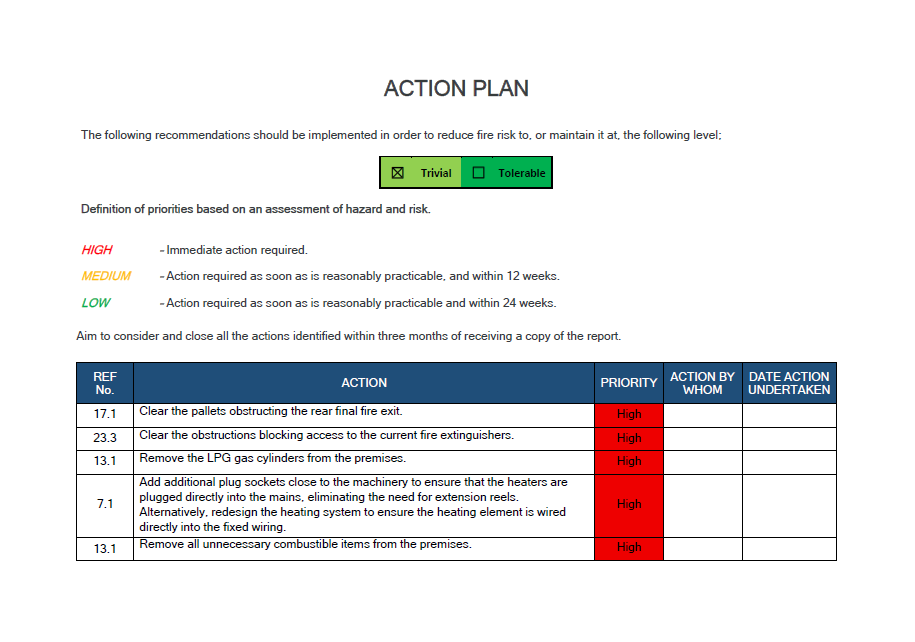 The report is designed so you can demonstrate compliance to enforcing authorities (Fire & Rescue Service, insurers, landlords, etc.) and brief your team without jargon.